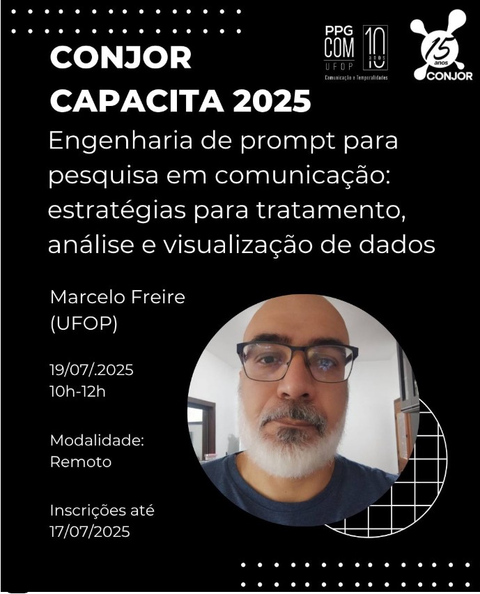 O curso "Engenharia de Prompt para pesquisa em comunicação: estratégias para tratamento, análise e visualização de dados" vai ser ministrado pelo professor Marcelo Freire, do Departamento de Jornalismo (Dejor) e do Programa de Pós-Graduação em Comunicação (PPGCOM) da UFOP. As inscrições podem ser realizadas pelo formulário.