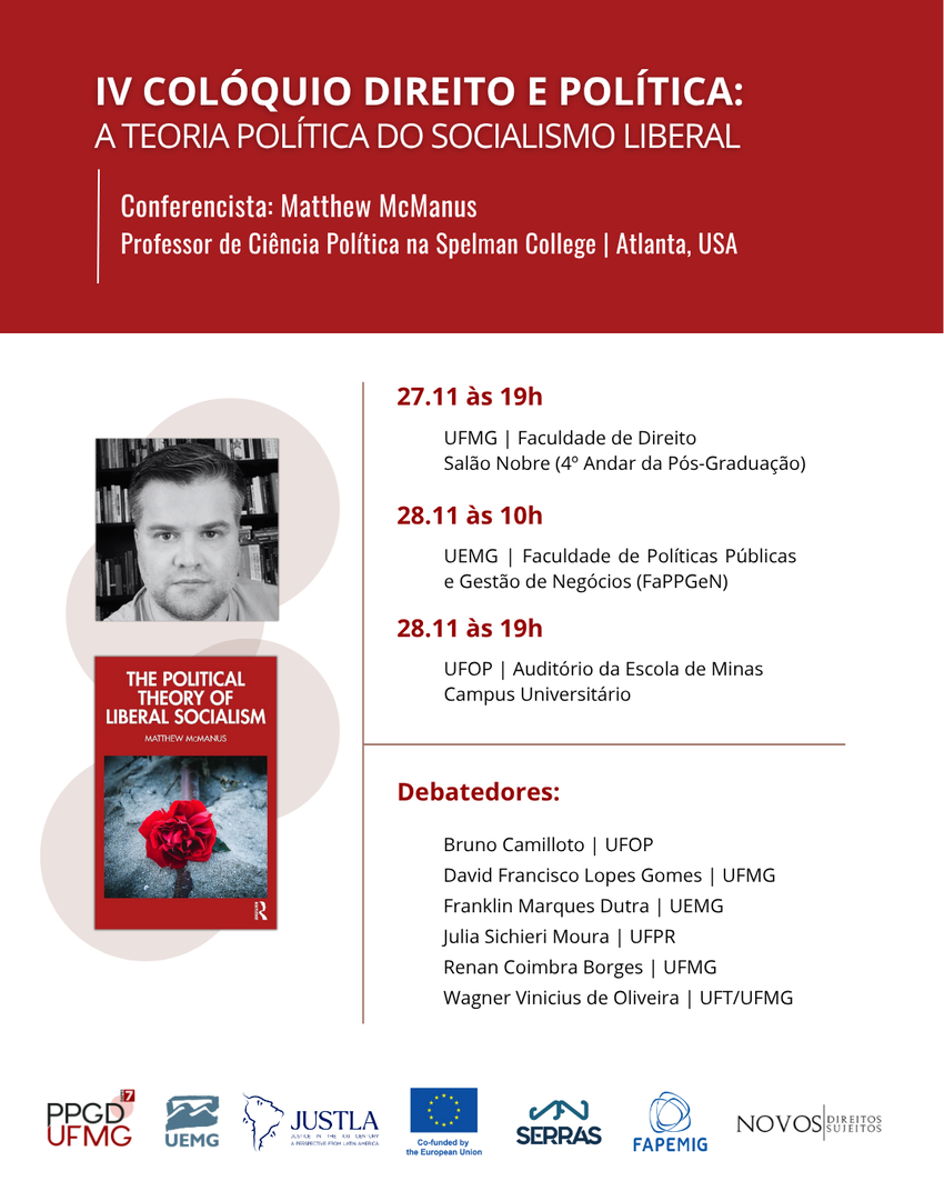 28/11 (10h às 12h) - Conferência: "O Argumento em Defesa do Socialismo Liberal no Século XXI", de Matthew McManus. Comentários de David Francisco Lopes Gomes (UFMG) e Franklin Vinícius Marques Dutra (Uemg).