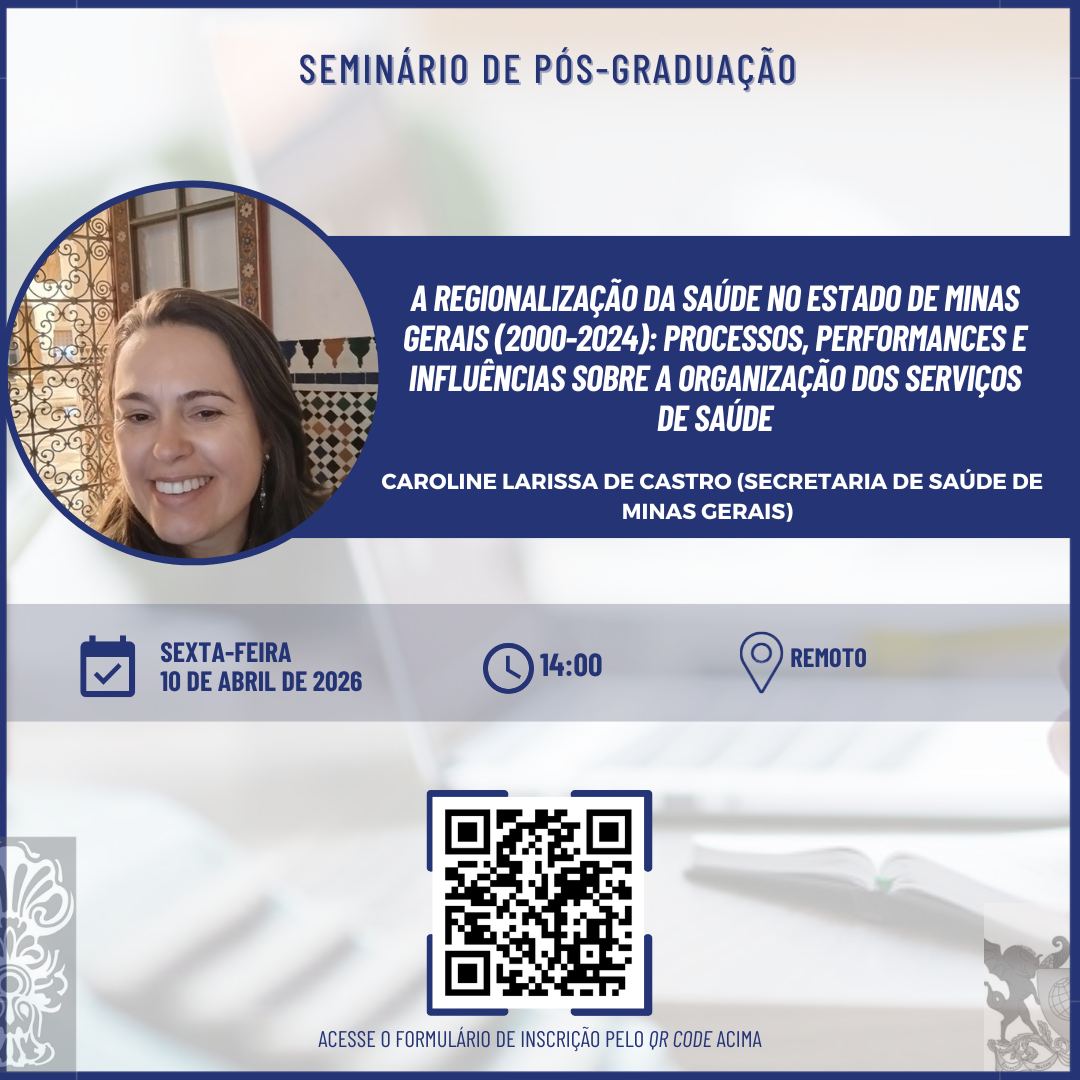 O Programa de Pós-graduação em Economia Aplicada da Universidade Federal de Ouro Preto (PPEA/UFOP) em parceria com o Programa de Pós-graduação em Economia Aplicada (PPGEA/UFV), convida para o primeiro seminário de 2026/1: A regionalização da saúde no Estado de Minas Gerais (2000-2024): processos, performances e influências sobre a organização dos serviços de saúde. A convidada é Caroline Larissa de Castro, da Secretaria de Estado de Saúde de Minas Gerais.