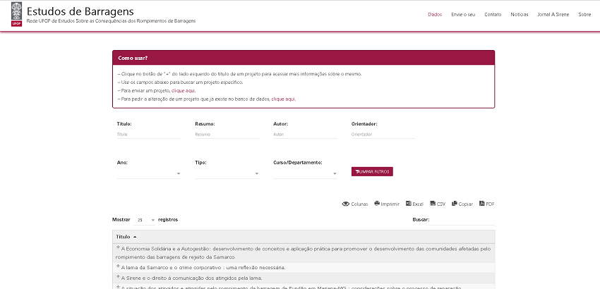 O site visa reunir todos os projetos e estudos realizados na UFOP sobre os recentes rompimentos de barragem ocorridos em Minas Gerais.