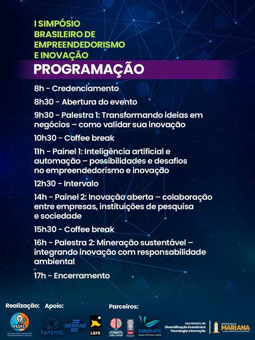 A programação reúne pesquisadores, empreendedores e estudantes em um dia de palestras, painéis e experiências práticas que aproximam o ambiente acadêmico do ecossistema de inovação. Os participantes podem escolher livremente entre acompanhar o simpósio ou integrar equipes no desafio.