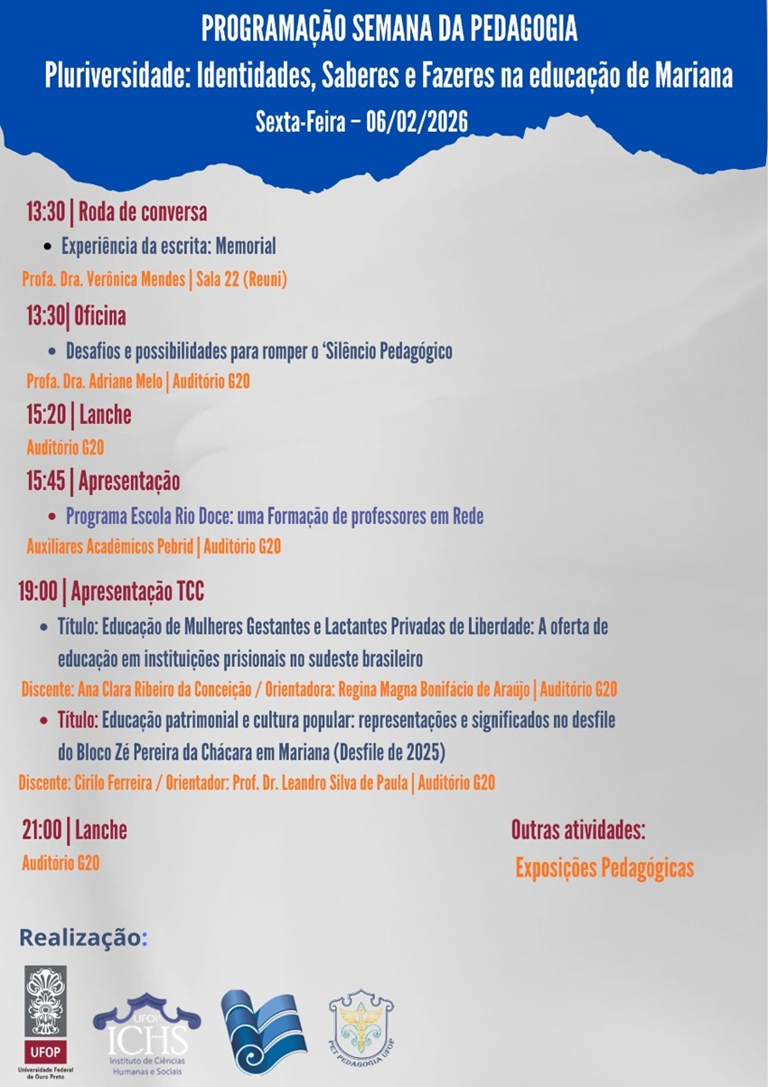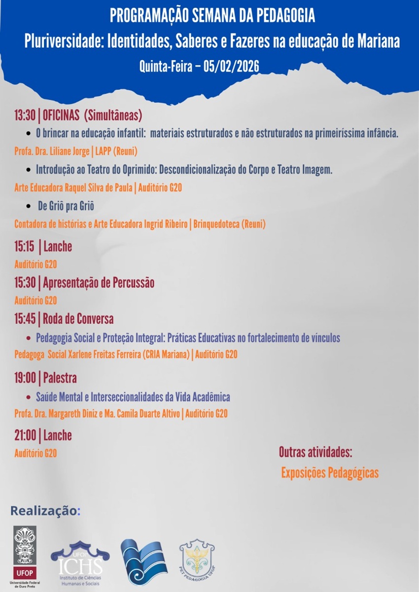 Com as atividades concentradas no auditório G20, a Semana da Pedagogia conta com mais de sete horas de programação sobre educação, cultura popular, educação feminina, práticas educativas, saúde mental, entre outros temas. O evento intercala oficinas, rodas de conversa, exposições pedagógicas, apresentações culturais, oficinas e pausas para alimentação.