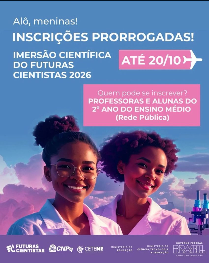 A imersão científica ocorre em janeiro de 2026. Podem se inscrever meninas que estão cursando o 2º ano do Ensino Médio na rede pública em 2025.