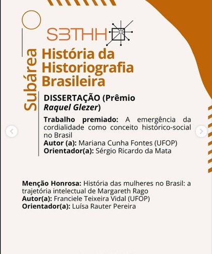 Mariana Cunha conta que deu início a sua trajetória de pesquisa ainda em 2019, investigando o conceito de cordialidade e buscando definir seus sentidos e usos na historiografia brasileira, em uma abordagem da história conceitual. A partir disso, obteve uma monografia aprovada com nota máxima e recebeu menção honrosa no concurso da SBTHH em 2023.