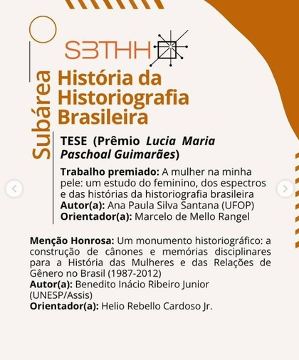 Também em 2019, Ana Paula Silva Santana iniciou a produção de sua tese, logo após finalizar o mestrado, analisando personagens, trajetórias e narrativas de mulheres que aparecem na literatura brasileira do século XIX, a partir da teoria da história e da história da historiografia. Vencedora na categoria de melhor tese em História da Historiografia Brasileira, ela comenta sobre a premiação: "Fico muito feliz, por se tratar de um prêmio importante para a área que eu trabalho e estudo. Só tenho a agradecer à SBTHH e ao meu orientador por todo o apoio".